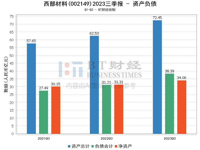 从资产负债方面来看,西部材料2023年三季报显示,资产总计达到72.45亿元,相较上年度末的63.98亿元有了显著增长。负债合计也从32.02亿元增加到38.39亿元,净资产则从31.96亿元提升至34.06亿元。资产负债率略有上升,从50.05%增至53%,反映出公司在扩大规模的同时,负债水平也有所提高。
