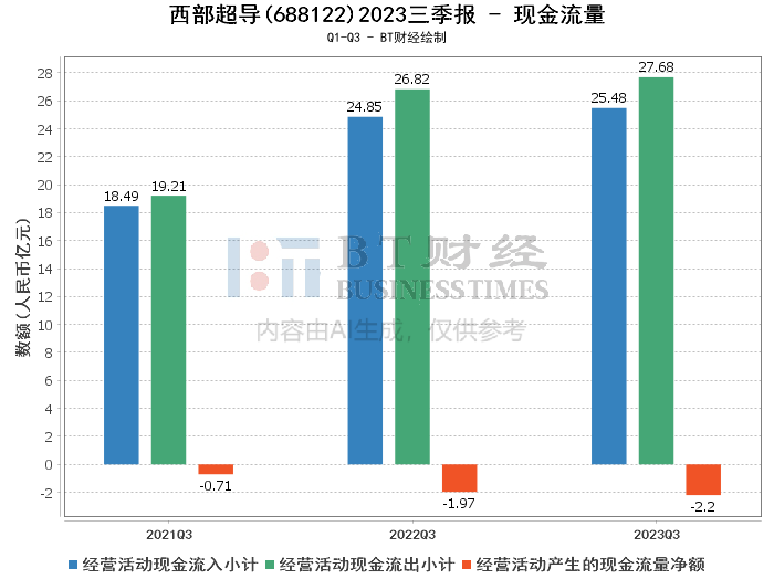现金流量方面,西部超导的经营活动现金流入小计从上年同期的24.85亿元增加到25.48亿元,而现金流出小计从26.82亿元增加至27.68亿元,导致经营活动产生的现金流量净额为负2.2亿元。