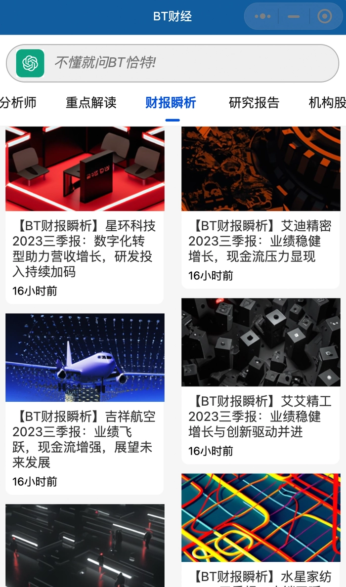 2023年对于BT财经也是不平凡的一年,这一年,我们实现了从内容创作者向内容创作和AI产品研发的转变,在国产大模型基础上推出了财报瞬析的产品,全面接入几乎全部的资本资讯平台和炒股软件,实现企业财报发出半小时内推送财报解读内容。