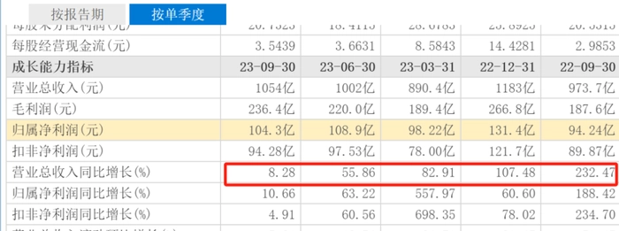 据最新财报显示,归母净利润的增幅受营收增幅的下滑影响,整体也出现下滑趋势。近五个季度的净利润分别为94.24亿元、132.4亿元、98.22亿元、108.9亿元和104.3亿元,增幅分别为188.42%、60.60%、557.97%、63.22%和10.66%。2023年一季度,净利润增幅一度高达557.97%,但到第三季度已经骤降至10.66%。创下近6个季度的增幅新低。
