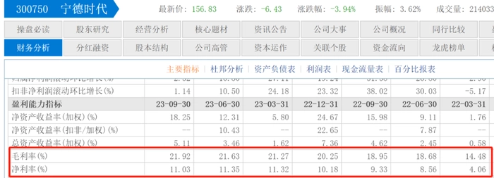 2023年三季报显示,宁德时代的毛利率为21.92%,2022年同期毛利率为18.95%,提升了2.97个百分点。毛利率由2022年一季度的14.48%,一路提升至21.92%,提升了7.44个百分点。进入2023年以来,三个季度的毛利率分别为21.27%、21.63%和21.92%,增幅不大,却依然呈上升趋势。净利率方面同样由2022年第一季度的4.06%提升至11.04%,提升了近7个百分点。