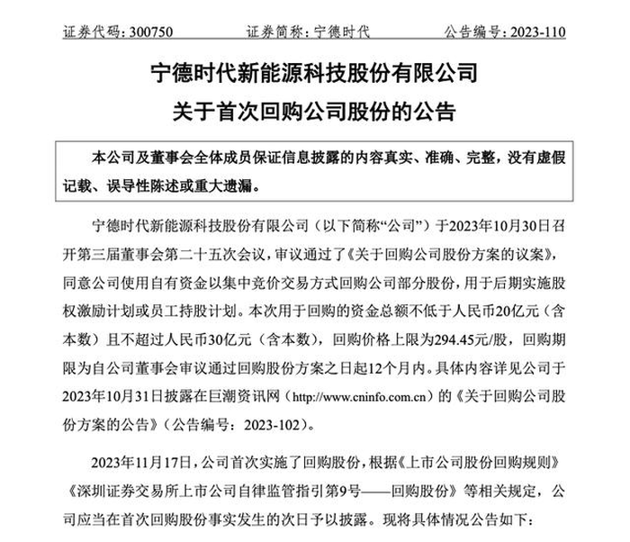 为稳定股价,增强投资者信心,2023年10月31日,宁德时代发布公告称,拟花费20亿-30亿元自有资金进行股权回购,这是宁德时代上市以来的首次回购,公告披露回购股权的目的是为增强投资者对公司的投资信心,并健全公司长效激励机制,回购股份在未来合适时机将用于股权激励计划或员工持股计划。