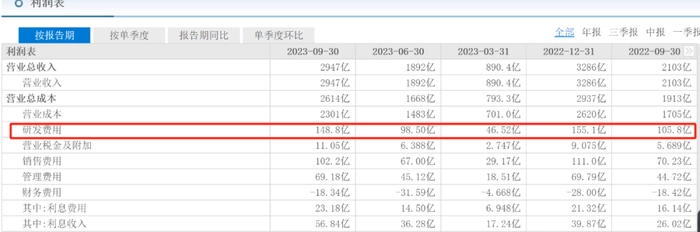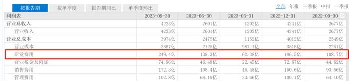 财报显示,近五个季度的研发费用分别为105.8亿元、155.1亿元、46.52亿元、98.5亿元和148.8亿元。同比增幅分别是130.18%、101.66%、81.16%、70.77%和40.65%。研发投入占总营收的比例分别为5%、4.7%、5.2%、5.2%和5%,研发占比基本维持在5%左右。2020年至2022年,研发费用分别为35.69亿元、76.91亿元和155.1亿元,增幅分别为19.29%、115.48%和101.66%。研发占比分别7.1%、5.9%和4.7%,研发占比总体依然保持在5%左右。