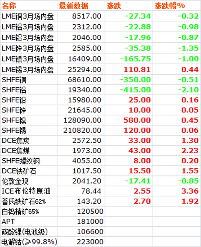 1月3日,LME六种基本金属价格跌多涨少,仅锡小幅上涨,锌跌幅较大。三月期铜价探底回升,收于8517美元/吨,下跌0.32%。三月期铝价收于2312.5美元/吨,下跌0.98%。三月期铅价收于2046美元/吨,下跌0.87%。三月期锌价震荡回落,收于2585.5美元/吨,下跌1.35%。三月期锡价收于25294美元/吨,上涨0.44%。三月期镍价收于16409美元/吨,下跌1.00%。