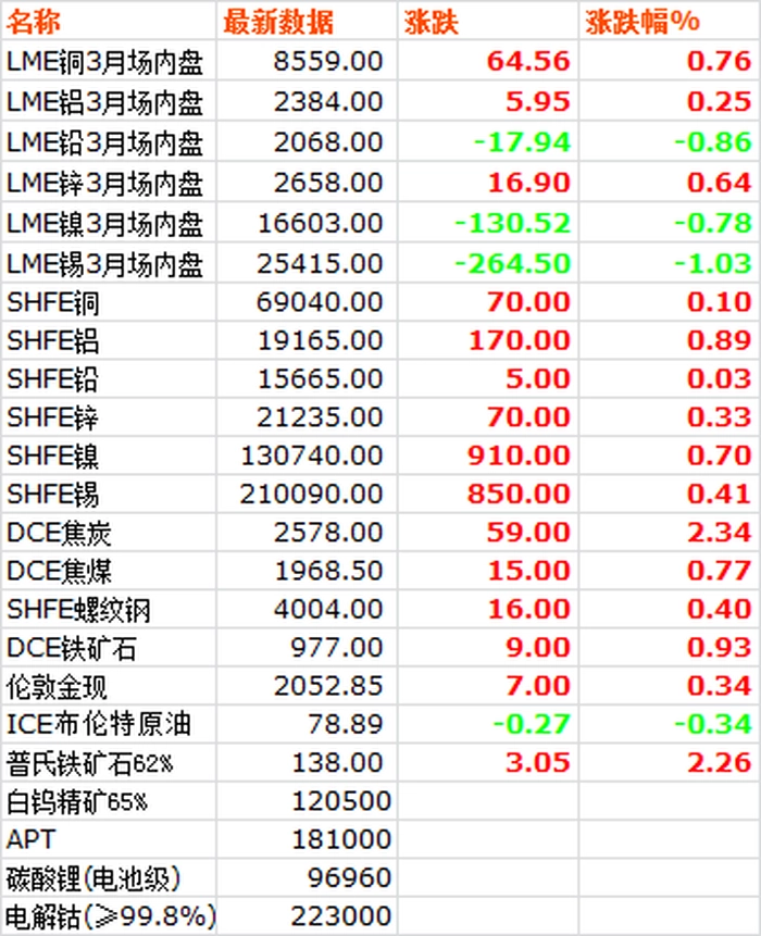 12月29日,LME六种基本金属价格跌多涨少,锡领跌,铝锌小幅上涨。三月期铜价收于8559美元/吨,下跌0.76%。三月期铝价收于2384美元/吨,上涨0.25%。三月期铅价收于2068.5美元/吨,下跌0.86%。三月期锌价收于2658美元/吨,上涨0.64%。三月期锡价收于25415美元/吨,下跌1.03%。三月期镍价收于16603美元/吨,下跌0.78%。