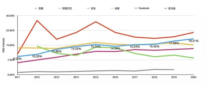 放眼全球,百度的研发占比同样令人瞩目。与欧美发达国家的科技公司相比,百度研发占比仅次于脸书,高于谷歌和亚马逊。在全球范围内,百度与华为一道成为为数不多上榜的中国企业。从百度近几年的研发占比增速来看,其正蓄势待发,有望在未来实现更大的突破。