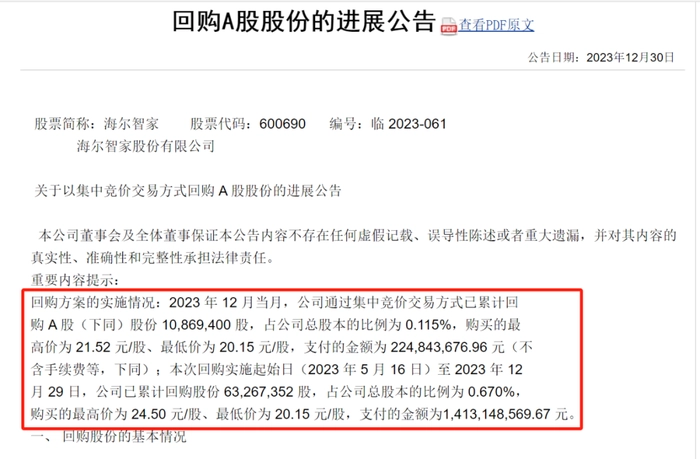 2023年12月29日,海尔智家(600690)发布公告称,2023年12月,海尔智家已累计回购10867万股,耗资2.25亿元。自2023年5月16日以来海尔智家已累计回购股份6326.7万股,占总股本的0.670%。共耗资14.13亿元。