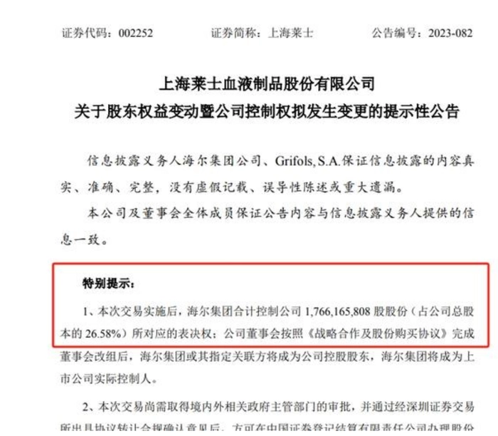 根据上海莱士公告,股东基立福与海尔集团公司签署《战略合作及股份购买协议》,海尔集团拟协议收购基立福持有的上海莱士13.29亿股股份,占上海莱士总股本的20.00%,转让价款125.00亿元。海尔集团耗资125亿元拿下上海莱士20%的股权之余,还获得基立福委托的剩余4.37亿股对应表决权的行使权。据悉4.37亿股约占上海莱士总股份的6.58%。
