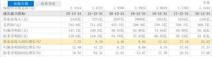 美的集团也难逃行业周期,据财报显示,2016年至2018年,营收增幅为14.71%、51.35%和8.23%,在2017年录得51.35%的高增长后,连续三年营收增幅为个位数,2019年为6.71%,2020年为2.27%。2021年美的集团大爆发,营收增幅达20.18%,但2022年则骤降至0.68%。