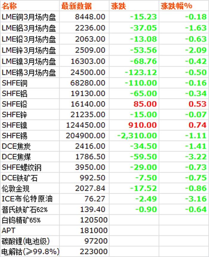 1月8日,LME六种基本金属价格全线下跌,锌铝跌幅居前。三月期铜价探底回升,收于8448美元/吨,下跌0.18%。三月期铝价震荡回落,收于2236.5美元/吨,下跌1.63%。三月期铅价收于2063美元/吨,下跌0.63%。三月期锌价持续回落,收于2509美元/吨,下跌2.09%。三月期锡价收于24500美元/吨,下跌0.50%。三月期镍价收于16303美元/吨,下跌0.42%。