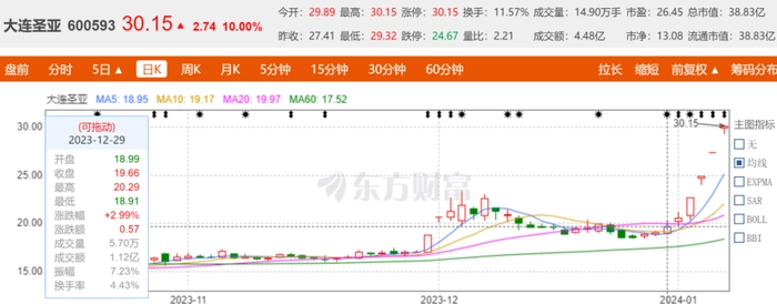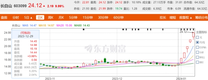 目前哈尔滨的热度已经延伸到了整个东北,尤其是旅游相关的上市公司,东北相关旅游股长白山(603099.SH)已连续8个交易日上涨,最近连续5个交易日收盘涨停,截至1月8日收盘股价为24.12元/股,在2023年最后一个交易日收盘价为14.98元/股,新年第一周该股涨幅达61%。大连圣亚(600593.SH)同样连续8个交易日上涨,最近连续4个交易日收盘涨停,截至1月8日收盘股价为30.15元/股,进入2024年以来涨幅达53.4%。