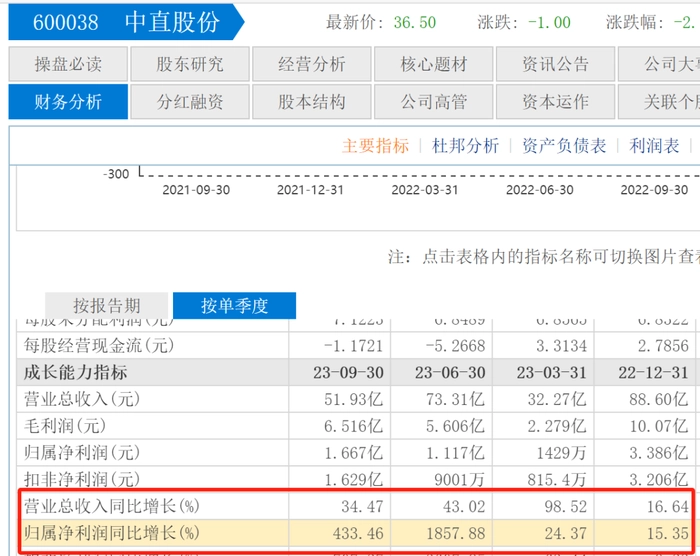 根据财报对比,在13家半年净利润过亿的企业中中直股份的业绩增长最为迅猛。2023年上半年中直股份营收105.6亿元,同比增长56.38%;净利润1.26亿元,同比增长632.48%。在2023年第三季度,中直股份营收51.93亿元,同比增长34.47%;净利润1.667亿元,同比增长433.46%。半年净利润增幅和单季度净利润增幅均超过400%。