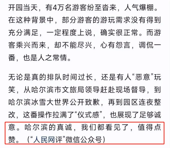 退票事件第二日,冰雪大世界就发布《致广大游客的一封信》,信中称“我们深表歉意。我们对服务不周进行深刻反思并连夜整改”。和以往出现类似情况的景区相比,哈尔滨冰雪大世界的致歉信诚意十足,在致歉信中冰雪大世界表示“从即日起,园区内娱乐项目采取现场排队和延时服务方式,设置排队信息提示,对游玩项目分时、分段提醒,满足游客体验需求。园区内增加安保、接待、志愿服务人员。增加投诉受理服务台和客服人员,线下线上同步受理解决游客诉求,接受广大游客的监督。”