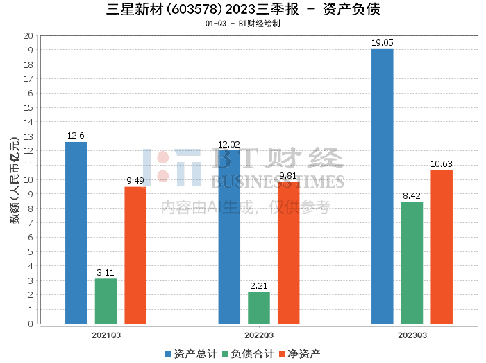 在资产负债方面,三星新材2023年三季报显示,公司总资产达到了19.05亿元,相比上年度末的12.09亿元增长了57.59%。负债合计为8.42亿元,较上年度末的2.38亿元大幅上升,净资产则从上年度末的9.7亿元增至10.63亿元。资产负债率为44.19%,上年同期为19.73%,商誉为1021.79万元。资产和负债的增长反映了公司规模的扩大和运营能力的增强。