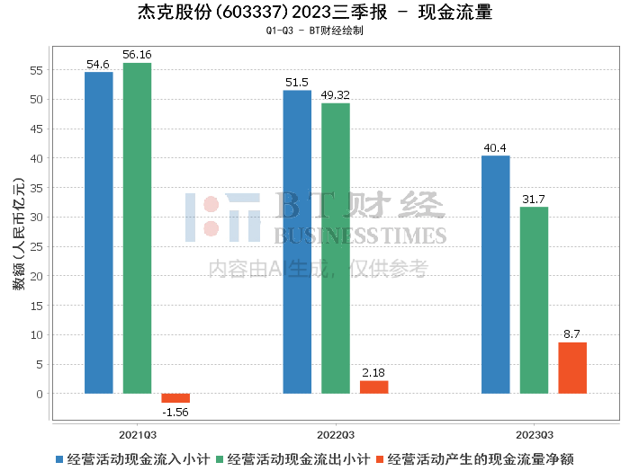 综合来看,杰克股份在2023年三季度面临市场挑战,但通过有效的成本控制和运营效率提升,实现了财务结构的稳健和现金流的大幅改善。虽然营业收入有所下滑,但公司整体盈利能力和现金流状况表现出积极的信号。