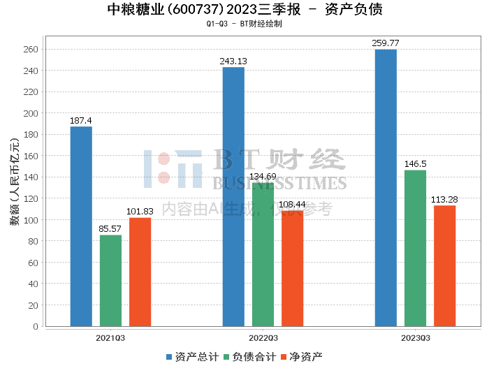 在资产负债方面,中粮糖业的总资产在2023年三季报中达到了259.77亿元,相比上年度末的200.66亿元有了显著增长。负债总额也从上年度末的91.99亿元增加到146.5亿元。尽管负债有所增加,净资产也实现了从108.67亿元增长至113.28亿元。资产负债率从上年度末的45.84%上升至56.39%,反映出公司杠杆率有所提高。