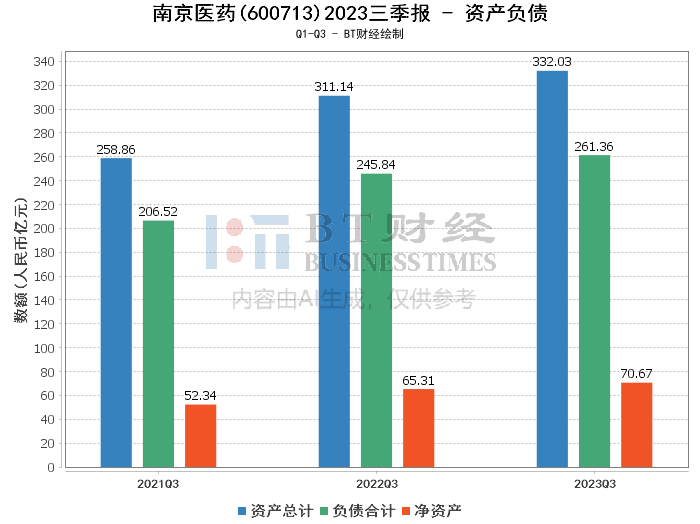 从资产负债方面来看,南京医药2023年三季报显示,公司总资产从上年度末的316.51亿元增长至332.03亿元,增长了4.90%。负债合计也有所增加,从上年度末的249.56亿元上升至261.36亿元。净资产则从66.95亿元增至70.67亿元,资产负债率略有下降,从78.85%微降至78.72%,显示公司资产结构相对稳定。