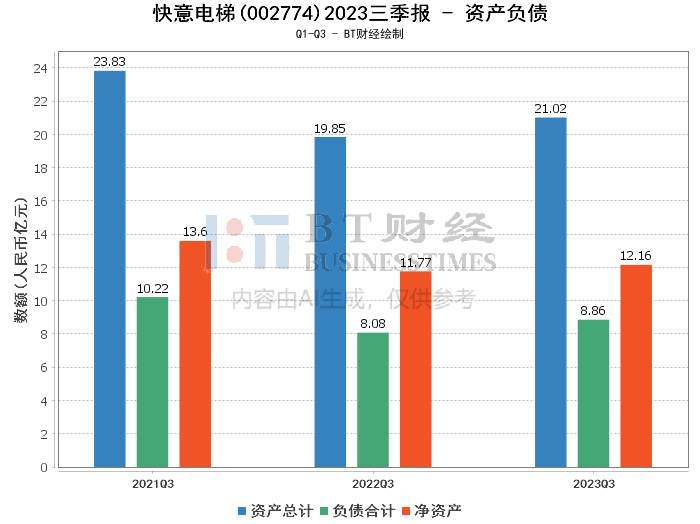 资产负债方面,快意电梯2023年三季报显示,公司总资产达到21.02亿元,相较上年度末的20.3亿元,增长了3.58%。负债合计为8.86亿元,较上年度末的8.26亿元上升了7.25%。净资产则小幅增长至12.16亿元,从上年度末的12.03亿元微增1.09%。资产负债率略有上升,从上年度末的40.71%增至42.14%,反映出公司财务杠杆的轻微上升。