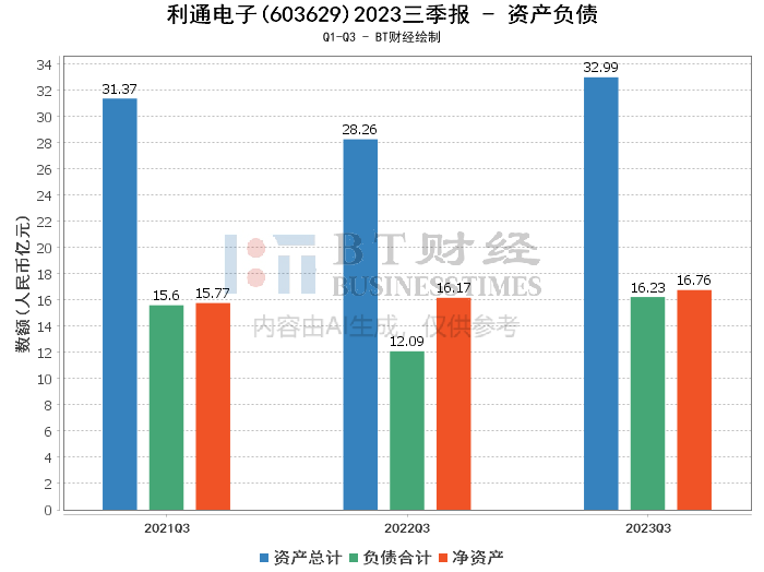 在资产负债方面,利通电子2023年三季报显示,公司总资产达到32.99亿元,较上年度末的28.77亿元增长14.66%,展现出公司资产规模的扩张。负债合计为16.23亿元,相较于上年度末的12.42亿元增加了30.68%,这可能反映了公司为扩大生产规模或研发投入所采取的融资行为。净资产则从上年度末的16.35亿元微增至16.76亿元。资产负债率从43.17%上升至49.19%,显示出公司财务杠杆的提升。