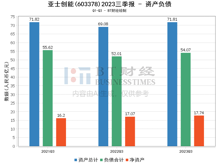 从资产负债方面来看,亚士创能在2023年三季度末的总资产达到了71.81亿元,相比上年度末的65.83亿元增长了9.08%。负债合计为54.07亿元,较上年度末的48.58亿元上升了11.28%。净资产则从上年度末的17.26亿元增长至17.74亿元,增长幅度为2.82%。资产负债率略有上升,从上年度末的73.79%增至75.29%,反映出公司财务杠杆的轻微增加。