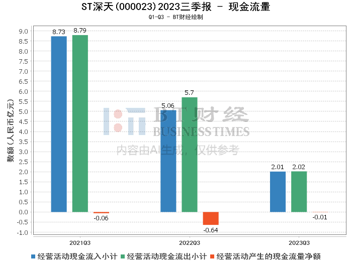 现金流量方面,ST深天的经营活动现金流入小计为2.01亿元,较上年同期的5.06亿元有所减少。经营活动现金流出小计为2.02亿元,较上年同期的5.7亿元也有所降低。经营活动产生的现金流量净额为-146.3万元,较上年同期的-6.4亿元有显著改善,这表明公司在现金流管理上取得了一定的成效。