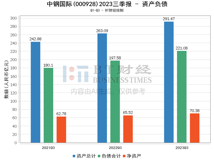 资产负债方面,中钢国际2023年三季度末的总资产达到291.47亿元,较上年度末的266.74亿元增长了9.27%,显示出公司资产规模的稳步增长。负债合计同样上升,从上年度末的198.76亿元增至221.08亿元,增长幅度为11.23%。净资产从67.98亿元增加到70.38亿元,增长了3.73%,反映出公司所有者权益的增长。资产负债率略有上升,从上年度末的74.51%增至75.85%,表明公司负债水平有所增加。
