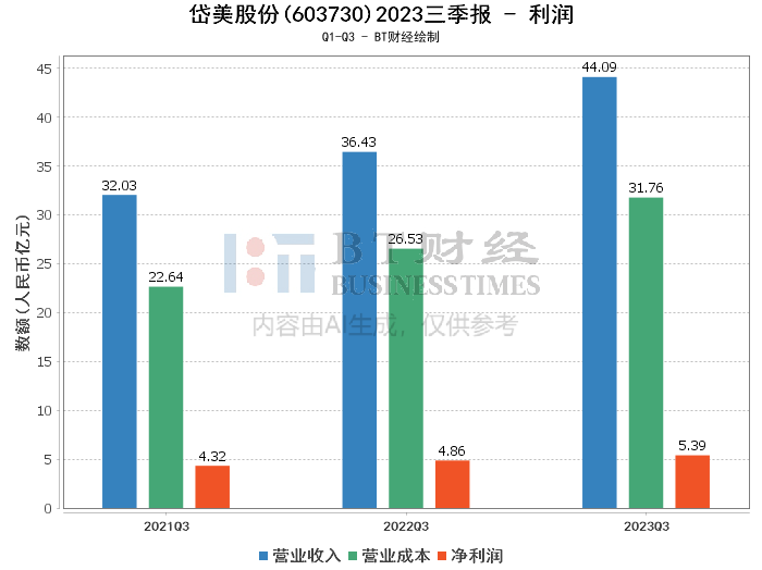 从利润表现来看,岱美股份在报告期内实现了营业收入44.09亿元,同比增长21.02%,营业利润达到6.42亿元,同比增长14.29%。营业成本也有所上升,从26.53亿元增至31.76亿元。净利润从上年同期的4.86亿元增长到5.39亿元,增长率为10.89%。这一增长可能得益于公司不断优化的生产效率和成本控制。