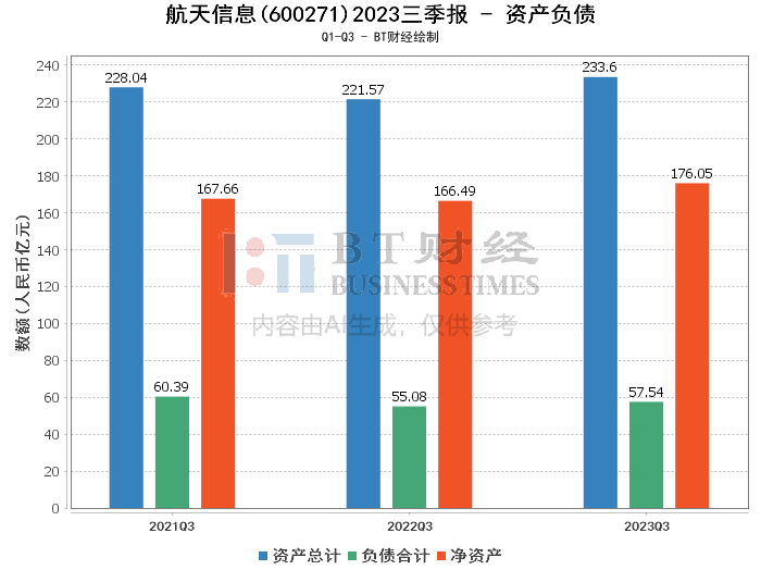 从资产负债方面来看,航天信息2023年三季报显示,公司总资产为233.6亿元,相比上年度末的236.82亿元略有下降。负债合计为57.54亿元,较上年度末的59.59亿元有所减少。净资产为176.05亿元,上年度末为177.23亿元。资产负债率为24.63%,较上年度末的25.16%有所下降。这些数据反映出公司资产结构保持稳定,财务状况健康。