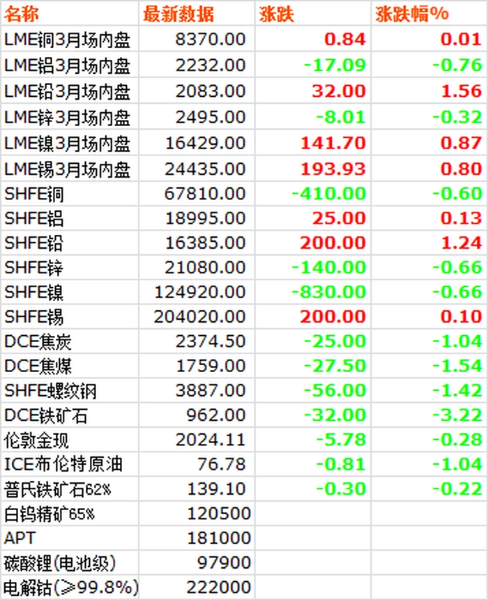 1月10日,LME六种基本金属价格涨多跌少, 铅领涨。三月期铜价收于8370.5美元/吨,上涨0.01%。三月期铝价震荡回落,收于2232.5美元/吨,下跌0.76%。三月期铅价收于2083.5美元/吨,上涨1.56%。三月期锌价冲高回落,收于2495.5美元/吨,下跌0.32%。三月期锡价收于24435美元/吨,上涨0.80%。三月期镍价收于16429美元/吨,上涨0.87%。