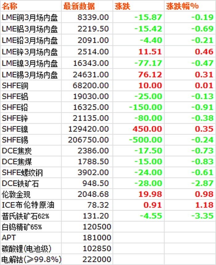 1月12日,LME六种基本金属价格跌多涨少,铝跌幅居前,锌锡小幅上涨。三月期铜价冲高回落,收于8339美元/吨,下跌0.19%。三月期铝价收于2219.5美元/吨,下跌0.69%。三月期铅价震荡回落,收于2091美元/吨,下跌0.21%。三月期锌价探底回升,收于2514美元/吨,上涨0.46%。三月期锡价收于24631美元/吨,上涨0.31%。三月期镍价收于16343美元/吨,下跌0.47%。