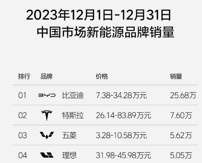 其中值得一提的是,2023年12月,比亚迪单月销量超过34.1万辆,同比增长45%。特斯拉的销量为9.4万辆。一直仅次于比亚迪的老二位置也被上汽通用五菱以11.8万辆的销量反超。