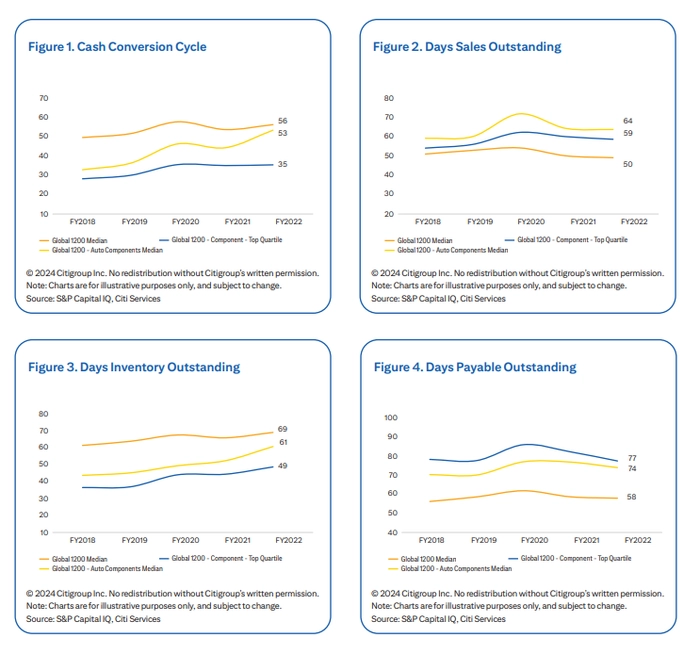 与原始设备制造商类似,与标普全球1200指数的中位数相比,汽车零部件供应商享有相对高效的现金转换周期。然而,尽管原始设备制造商 CCC的中位数在过去五年中提高了10天,但组件供应商的现金转换周期中位数却增加了20天,从33天增加到53天。
