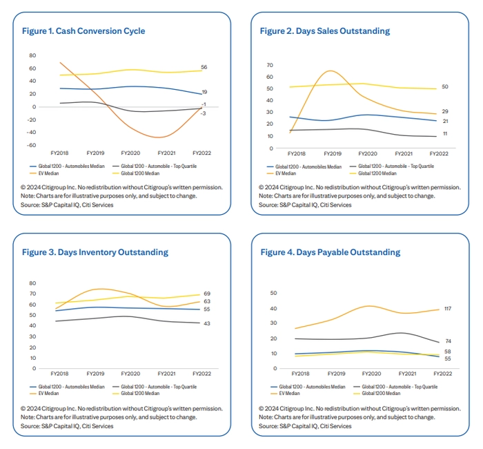尽管采取了有效的库存管理措施,但许多公司仍在应对库存短缺的问题,尤其是在整车市场。表现最好的原始设备制造商管理着接近零或负的现金转换周期(CCC)。虽然电动汽车原始设备制造商的数据有限,但他们的负面CCC表明,该行业的库存有限,客户愿意预订车辆。