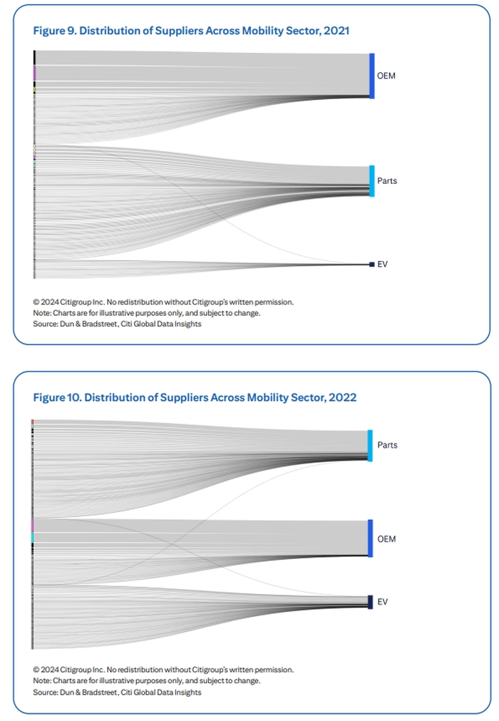 从2021年到2022年,当许多电动汽车制造商专注于提高交付量时,纯电动汽车制造商的供应商的数量增加了276%。与此同时,传统OEM供应商减少了20%。也许最令人惊讶的是类别之间的有限重叠,然而,这可能是由于出行行业供应链的线性性质。