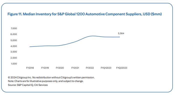 自2018年以来,汽车零部件公司的库存一直在稳步增长,并在2023年前两个季度保持在高位,这需要额外的营运资金来支持。