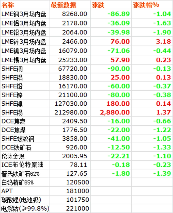 1月17日,LME六种基本金属价格跌多涨少,锌领跌,仅锡小幅上涨。三月期铜价收于8268美元/吨,下跌1.04%。三月期铝价收于2178美元/吨,下跌1.63%。三月期铅价收于2064美元/吨,下跌1.90%。三月期锌价收于2466美元/吨,下跌3.18%。三月期锡价收于25233美元/吨,上涨0.23%。三月期镍价收于16079美元/吨,下跌0.44%。
