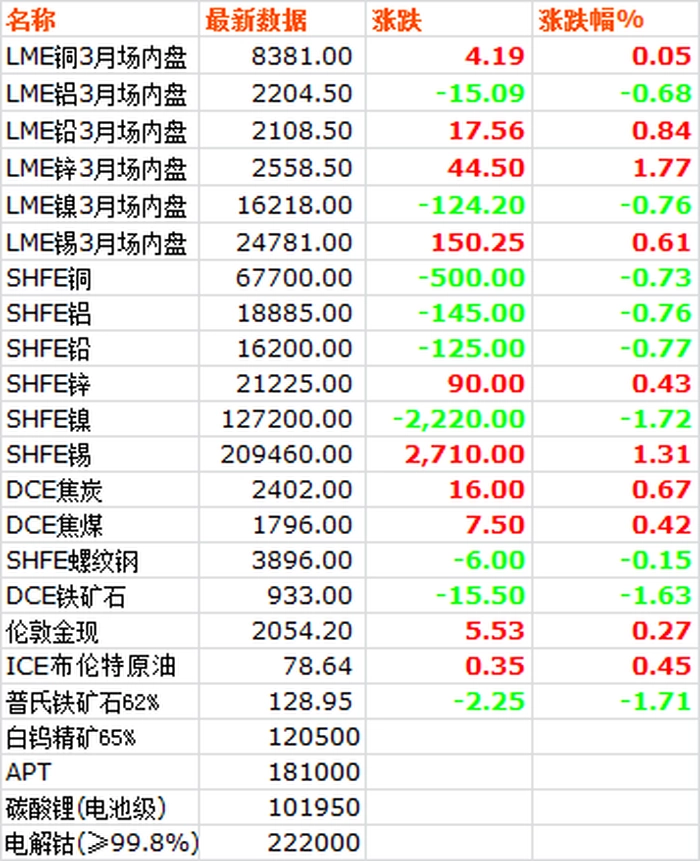 1月15日,LME六种基本金属价格涨多跌少,锌领涨,铝镍小幅下跌。三月期铜价震荡上涨,收于8381美元/吨,上涨0.50%。三月期铝价震荡回落,收于2204.5美元/吨,下跌0.68%。三月期铅价震荡上涨,收于2108.5美元/吨,上涨0.84%。三月期锌价冲高后小幅回落,收于2558.5美元/吨,上涨1.77%。三月期锡价收于24781美元/吨,上涨0.61%。三月期镍价收于16218美元/吨,下跌0.76%。