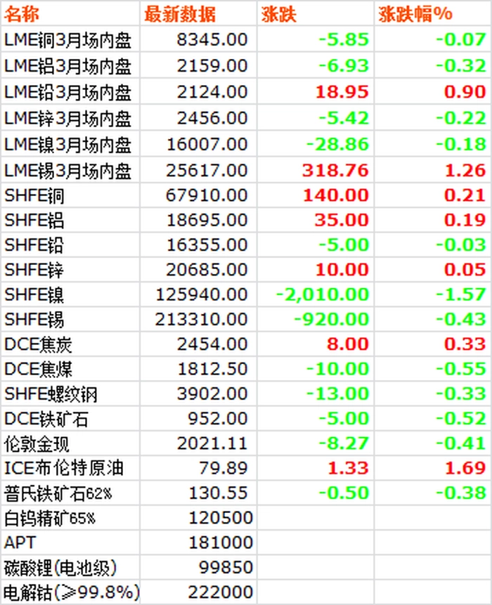 1月22日,LME六种基本金属价格跌多涨少,锡铅上涨。三月期铜价窄幅震荡,收于8345.5美元/吨,下跌0.07%。三月期铝价收于2159美元/吨,下跌0.32%。三月期铅价先抑后扬,收于2124.5美元/吨,上涨0.90%。三月期锌价收于2456.5美元/吨,下跌0.22%。三月期锡价收于25617美元/吨,上涨1.26%。三月期镍价收于16007美元/吨,下跌0.18%。