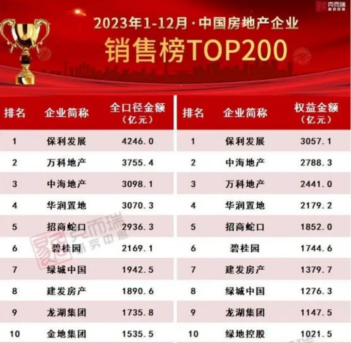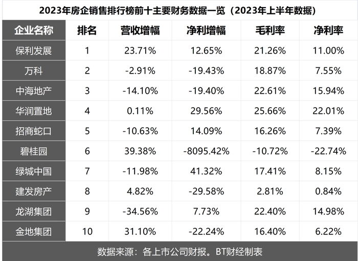 在克而瑞发布的2023年房企销售榜单中(为统一公平,仅以2023年半年报数据对比),保利发展营收增长23.71%,净利润增长12.65,%。万科、中海地产、招商蛇口、绿城中国和龙湖地产的营收下滑。万科、中海地产、碧桂园、建发房产和金地集团的净利润下滑。前十房企中,营收下滑的有5家,净利润下滑的也有5家。前十房企中毛利率高于20%的有保利发展、中海地产、华润置地和龙湖集团,前三家均为国企,龙湖为民营地产中毛利率最高的一家,同时也是民营地产中净利率最高的一家。