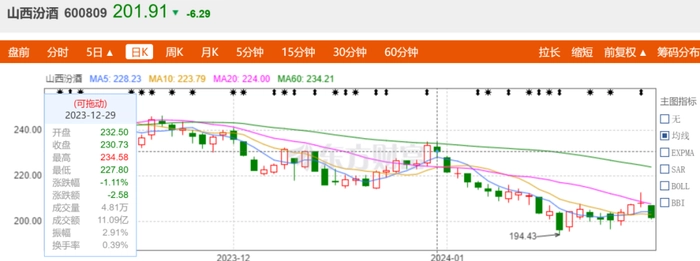 进入2024年,汾酒在资本市场的表现并不理想,2023年最后一个交易日收盘股价为230.73元/股,截至1月30日收盘股价为201.11元,再次下跌3.41%,在1个月不到的时间内,山西汾酒股价跌幅为13%。和2021年7月的375.65元的高点相比,跌幅达46.5%,市值蒸发了2152亿元。