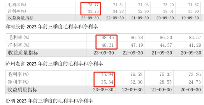 2023年前三季度,洋河股份的毛利率为75.77%,同比上一年同期的74.54%提升了1.23个百分点。净利率为33.75%,同比上一年同期的34.28%下滑了0.53个百分点。泸州老窖2023年前三季度毛利率为88.45%,同比上一年同期的86.78%提升了1.67个百分点。净利率为48.31%,同比上一年同期的47.19%提升了1.12个百分点。近4年同期,泸州老窖的毛利率和净利率由83.57%提升至88.45%和41.19%提升至48.31%,分别提升了4.88个百分点、7.12个百分点。洋河股份在近四年同期毛利率有明显提升,但净利率反而有0.15个百分点的下滑。