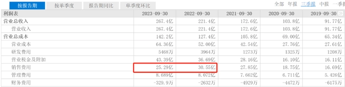 汾酒此前一直以重销售轻研发著名,此前销售费用一度超过研发费用的200倍以上。2023年前三季度,汾酒的销售费用为25.29亿元,相比上一年同期的30.55亿元下降了17.21%。这也是近5年来同期销售费用的首次下滑。同期研发费用为5468万元,同比增长37.95%。销售费用是研发费用的46.3倍,为近年来新低,2022年,销售费用还是研发费用的59倍。
