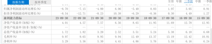财报数据显示,2023年前三季度,上汽集团的毛利率9.97%,相比上一年同期的9.65%还有0.32个百分点的提升,基本和2021年同期和2020年同期持平,但相比2019年以前动辄超过12%的毛利率,下滑还是较为明显。2023年前三季度毛利率为3.29%,相比上一年同期的3.36%下滑了0.7个百分点,对于营收高达5233亿元的上汽集团来说哪怕是下降0.01个百分点都是不小的收益损失。而更让上汽集团头疼的是,3.29%的净利率,已经是近9年同期新低。2022年,上汽集团的净利率为3.17%,更是近十年新低。相比2021年的4.47的净利率下滑幅度达1.3个百分点。