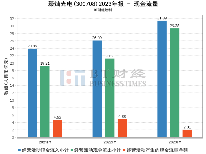 综上所述,聚灿光电在2023年的整体经营状况显示出积极的发展趋势。公司不仅在资产规模上实现了增长,在财务结构上也表现出更为健康的状态。利润方面,公司实现了营业收入和净利润的大幅增长,盈利能力显著提升。尽管现金流量净额有所下降,但这可能与公司的战略投入和市场扩张有关。