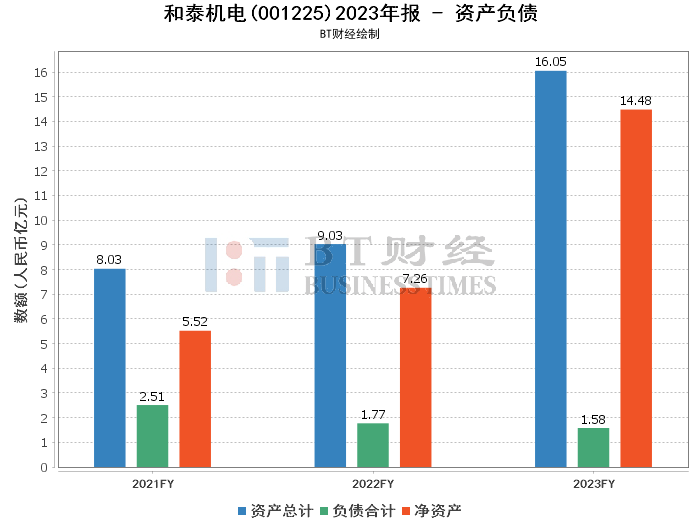 从资产负债方面来看,和泰机电的总资产从年初的9.03亿元增长到年末的16.05亿元,增长了77.72%。负债总额有所下降,从年初的1.77亿元减少到1.58亿元,资产负债率也由19.64%降至9.83%,显示公司的财务结构更为稳健。净资产从年初的7.26亿元增长到14.48亿元,增长了99.43%,反映出公司净值的显著增长。