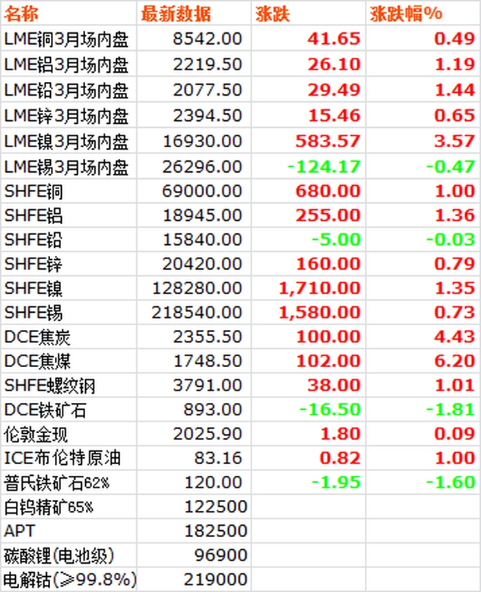 2月21日,LME六种基本金属价格涨多跌少,仅锡下跌,镍领涨。三月期铜价冲高后小幅回落,收于8542美元/吨,上涨0.49%。三月期铝价收于2219.5美元/吨,上涨1.19%。三月期铅价震荡上行,收于2077.5美元/吨,上涨1.44%。三月期锌价先扬后抑,收于2394.5美元/吨,上涨0.65%。三月期锡价收于26296美元/吨,下跌0.47%。三月期镍价收于16930美元/吨,上涨3.57%。