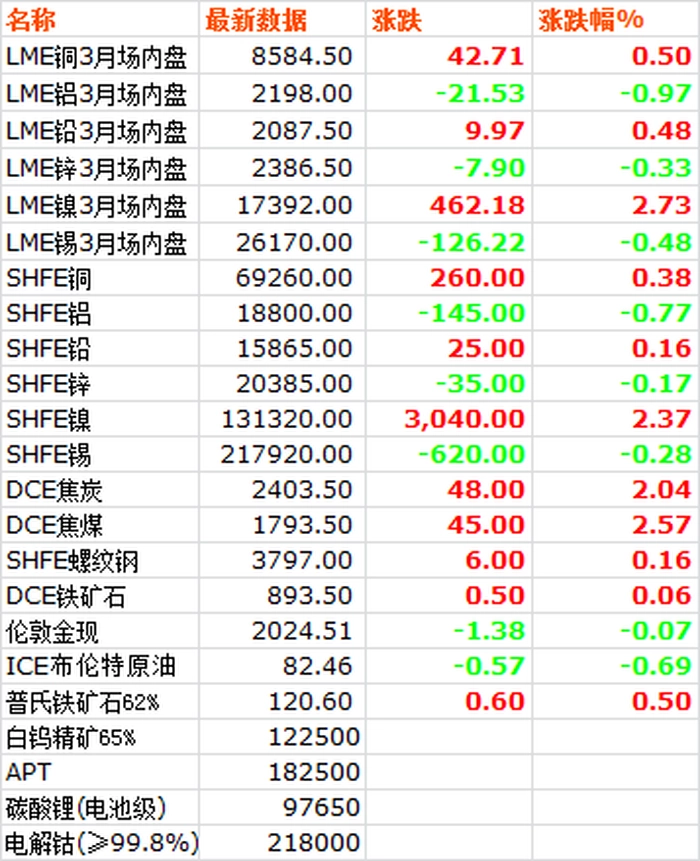 2月22日,LME六种基本金属价格涨跌互现,镍涨幅居前。三月期铜价偏强震荡,收于8584.5美元/吨,上涨0.50%。三月期铝价震荡回落,收于2198美元/吨,下跌0.97%。三月期铅价收于2087.5美元/吨,上涨0.48%。三月期锌价冲高回落,收于2386.5美元/吨,下跌0.33%。三月期锡价收于26170美元/吨,下跌0.48%。三月期镍价收于17392美元/吨,上涨2.73%。