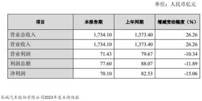 近期长城汽车发布2023年业绩快报。快报显示,2023年长城汽车总营收1734.10亿元,同比增长26.26%;归母净利润70.08亿元,同比下降15.22%。扣非归母净利润46.82亿元,同比增长4.58%。总体上看属于增收不增利。