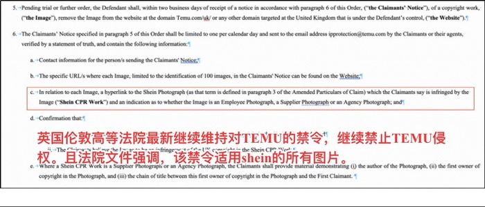 同年9月,针对Shein提起的上千张图片被Temu平台侵权,英国法院也对Temu颁布紧急临时限制令,要求其停止对Shein的侵权行为。到2024年2月英国法院再次对该禁令进行庭审,最新裁决继续维持对Temu禁令并且特别明确了禁令适用也是Shein有权投诉图片涉及的范围包括所有Shein的图片,Shein自主拍摄、供应商和摄影机构拍摄的Shein产品图片,Shein均可以投诉。Temu需要在接到通知后的两个工作日内对侵权图片进行处理。