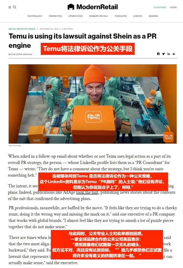 期间Temu也没闲着,两次对Shein发起反垄断、反竞争诉讼,关注国外法律的人士可能对此并不陌生,这些手段通常或是知识产权诉讼中被告为对冲而作出的应对策略之一。甚至也有海外行业人士认为Temu发起的对Shein小作文反诉讼是一种公关手段。